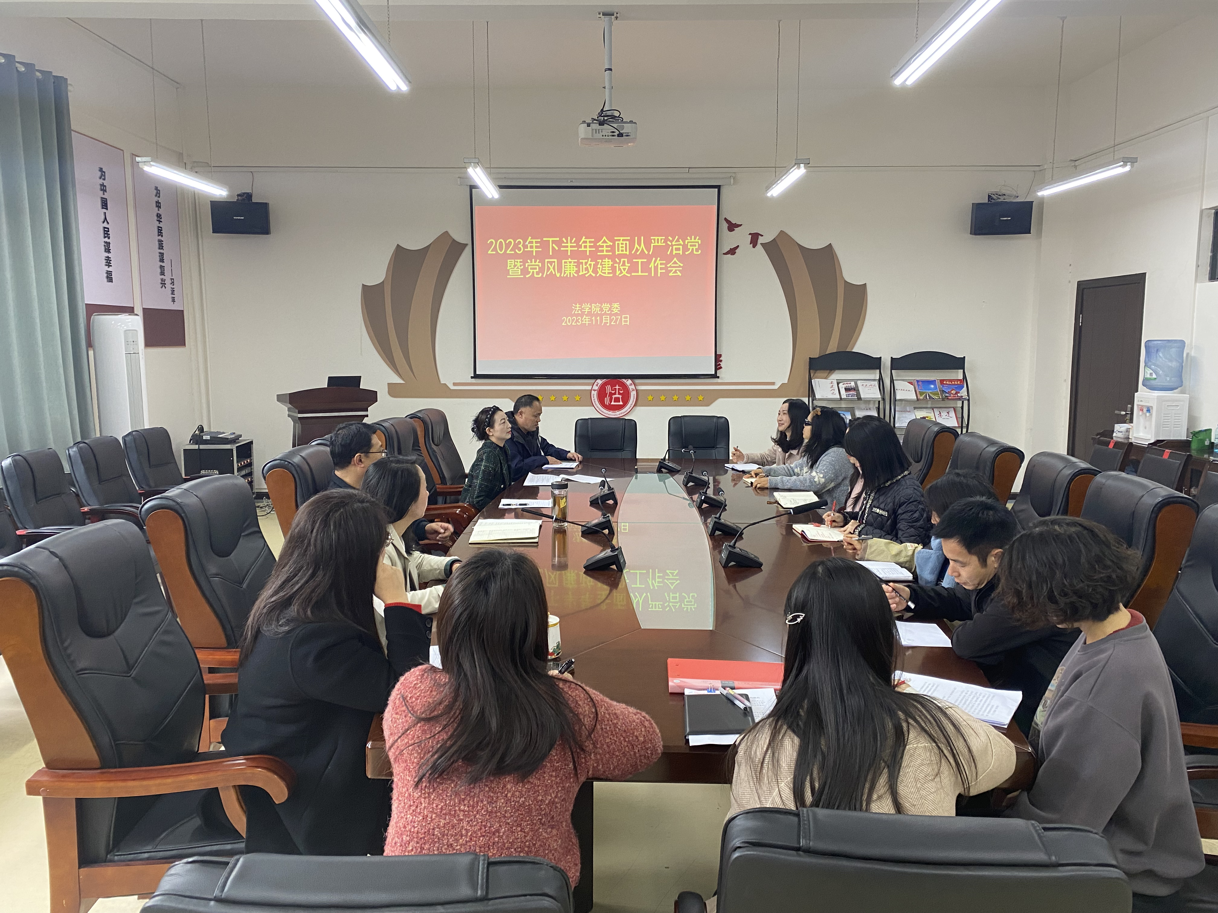 (法学院 莫丹洵 报道|摄影 )2023年11月27日,法学院党委在文德楼A8-310会议室召开2023年下半年全面从严治党暨党风廉政建设会。党委班子成员、各科室负责人、系负责人、党支部书记等全体行政人员参会,院党委书记詹伟主持会议。