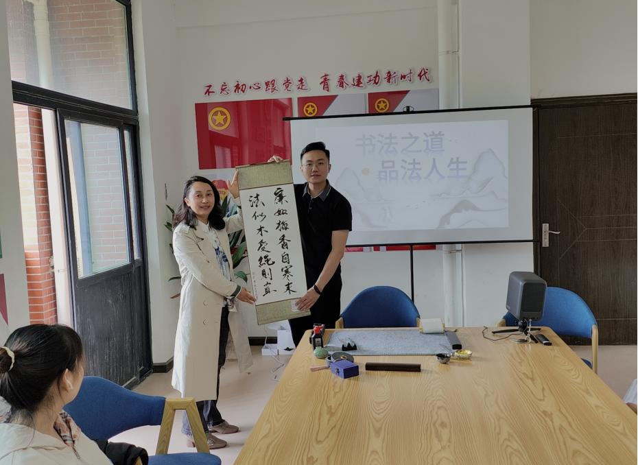 活动开始,代莉莎询问了同学们对书法的了解情况,向同学们分享了书法的历史渊源、艺术特点,鼓励同学们练习书法,在书法欣赏或者写作中感悟人生。随后,代莉莎以书法为载体,深入浅出地讲解了法律的基本原则、法律与生活的紧密联系等内容。最后,代莉莎带领同学们一起鉴赏部分同学准备好的书法作品,鼓励大家将法治与廉洁等内容融入书法作品中,创作出具有法律内涵的书法作品。