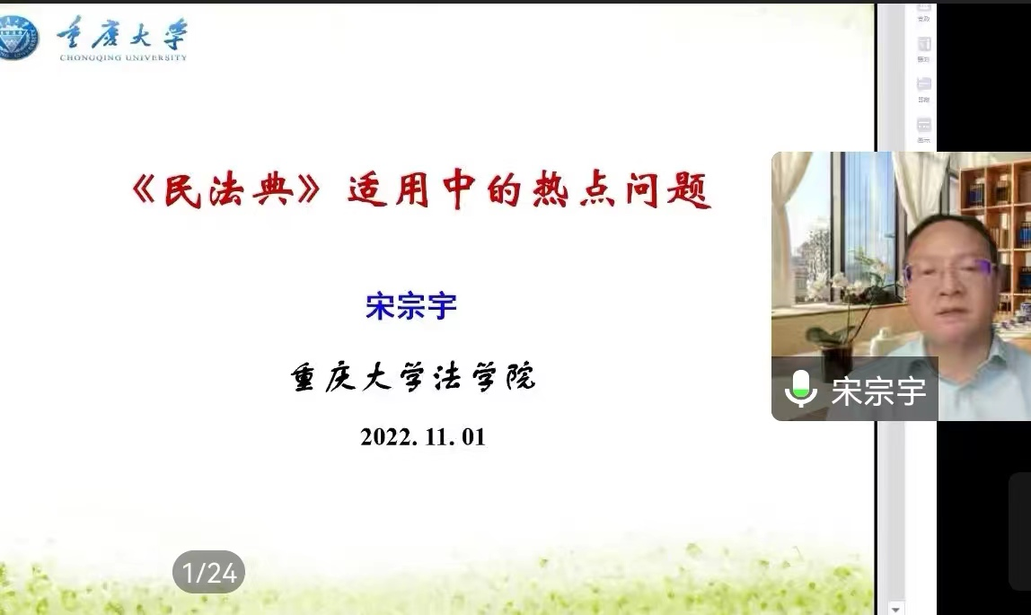 (法学院 图文/报道 樊慧萍)11月1日下午,由法学院承办的“《民法典》适用中的热点问题”讲座通过线上线下相结合的方式举行。本次讲座邀请到重庆大学法学院民商法学科负责人,法学博士、管理学博士后、二级教授、中国法学会民法学研究会理事宋宗宇教授主讲,法学院党委委员、教授曹务坤主持会议。法学院本科生、研究生及学校其他专业学生500余人次线上、线下共同聆听。