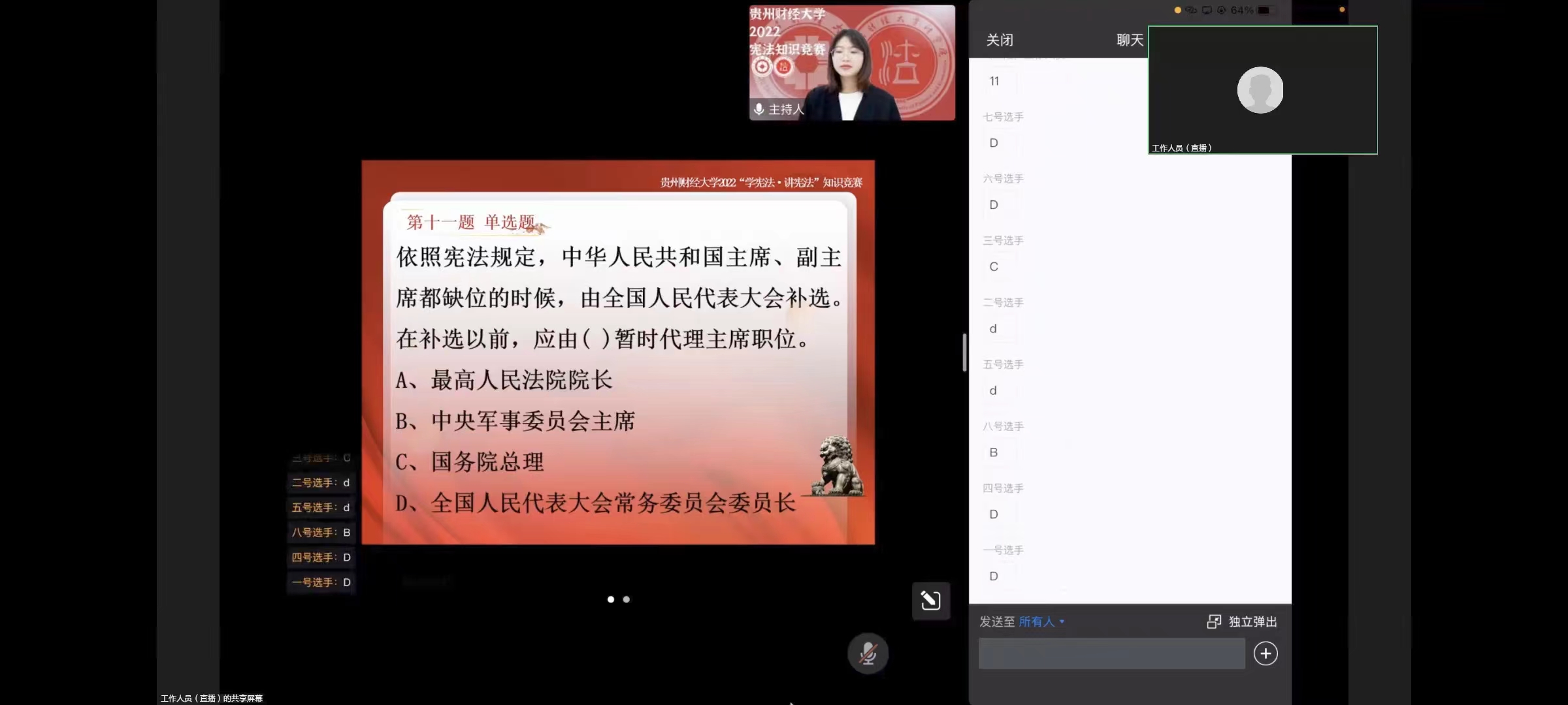 本次知识竞赛采用积分制,竞赛共分为两轮:抢答题和主观论述题,通过每轮积分的汇总来决出最终名次。在抢答题环节,选手们争先恐后,并驾齐驱。观众也自行踊跃抢答,整个比赛氛围十分紧张热烈。在主观论述部分,选手们沉稳冷静、条分缕析,既展现出宪法知识储备的深度与广度,也展现了大家的临场应变和语言表达的能力。