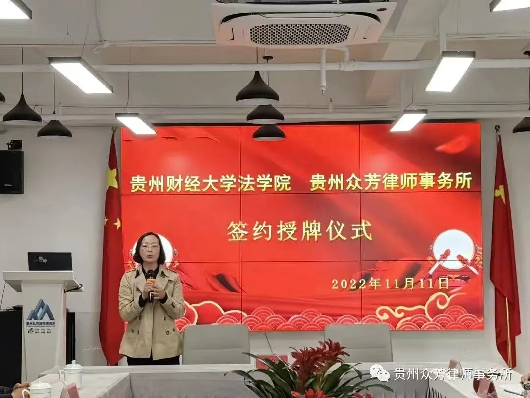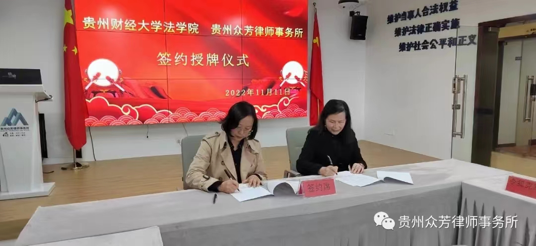 授牌仪式现场,米兰中国有限公司官网和贵州众芳律师事务所签订了《实践教学基地合作协议》。今后,双方将进行全方位、多层次的深入合作,包括互相提供平台,互派人员交流,建立学习、培训和交流机制,共同进行律师事务及律师业务发展方面的理论研究和课题研究。