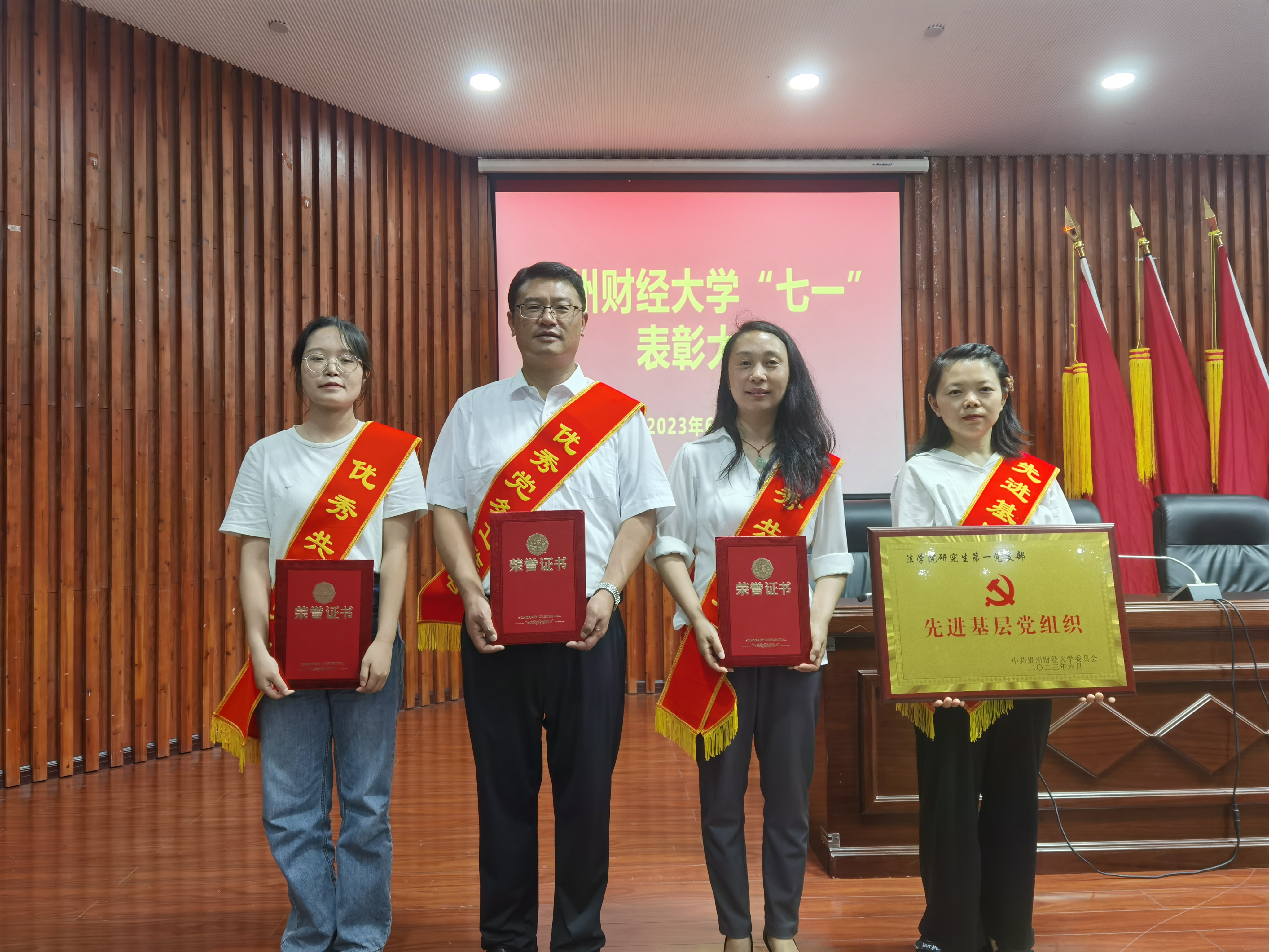 我院党委书记詹伟荣获“校优秀党务工作者”荣誉称号;党委委员、正处级专职组织员、纪委书记代莉莎,2022级民商法学硕士研究生罗迪迪获“校优秀共产党员”荣誉称号;研究生第一党支部获“校先进基层党组织”荣誉称号。