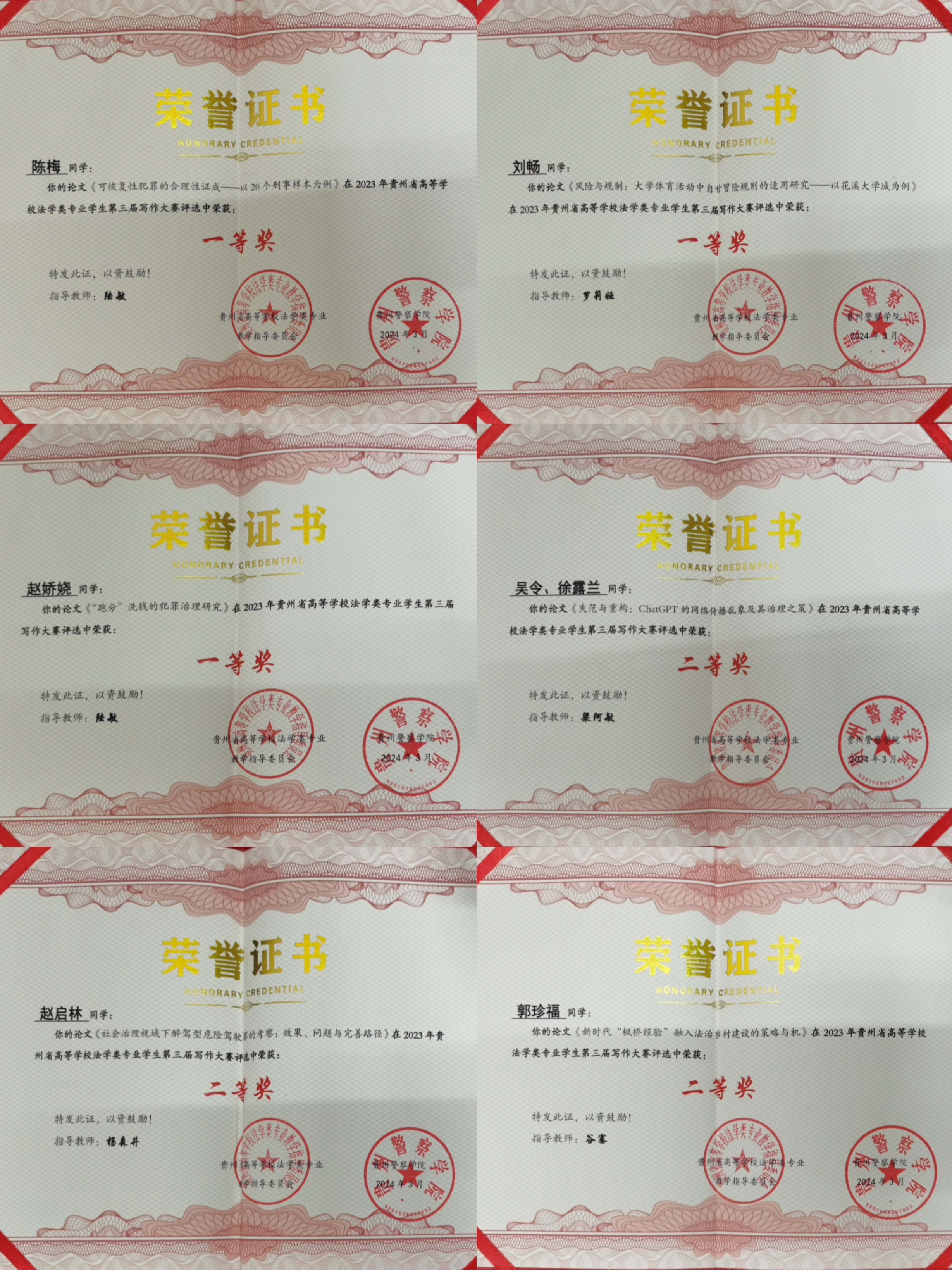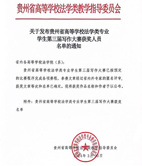 (法学院 图文/报道 陆敏)秉承米兰中国有限公司官网“学术立校”理念,法学院鼓励老师积极指导学生参赛,近日,法学院本科生在2023年贵州省高等学校法学类专业学生第三届写作大赛中取得佳绩,共有20篇论文获奖。其中,一等奖3项、二等奖5项、三等奖5项、优秀奖7项,获奖论文数量在省内高校中排名第二,同时也是法学院本科生连续参加三届比赛以来取得的最佳成绩。