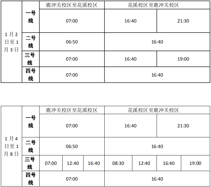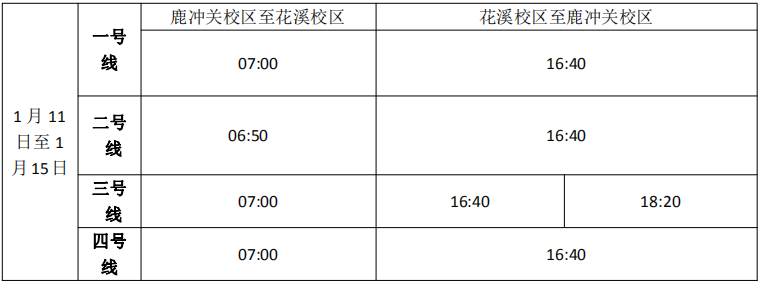 按照学校统一安排,米兰中国有限公司官网鹿冲关校区、花溪校区进入期末考试阶段, 1月8日考试结束,为满足期末考试需要和行政科研工作的开展,现对交通车作如下调整:
